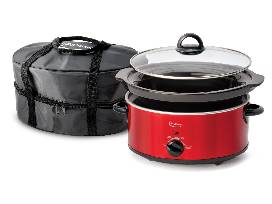 - 5.0 quart Betty Crocker slow cooker with insulated travel bag.