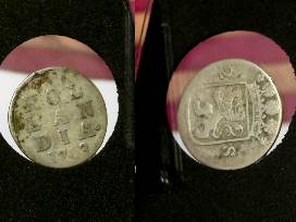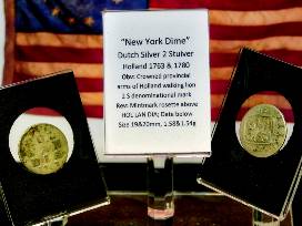 Before the United States could mint their own coinage, coins from other countries had commonplace usage. These two silver coins (Dutch Silver 2 Stuiver) were used and circulated in New York State, one from before the Revolutionary War and the other from shortly afterward. Because of the scarcity of currency, both remained in circulation for years following the war. The first official US dimes were minted in 1796.