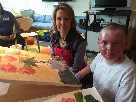 "Caden's Free Spirit" was done by Levine Children's Hospital Patient, Caden, with artist, Angela Nesbit. 9-year-old Caden while painting the flower vase told us his hands "didn't work so well right now" because he was severely burned in an apartment fire. But he managed to hold the paint brush, pick out colors and fill in the flowers. This painting is valued at $1300.
