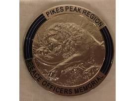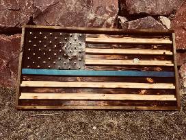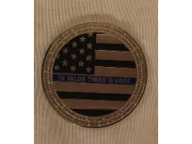 Blue Line Flag challenge coin display shelf that can hold up to 90 coins featuring 9mm shell casings for the stars on the flag. This piece measures 38 1/2"W X 20"H and includes a Pikes Peak Fallen Officer Memorial Challenge Coin to add to your collection. Handmade by CSPD Cmdr. Jensen and his son Kyle.