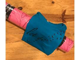 Enjoy 2 months of unlimited yoga sessions at Eighteenth Element Yoga with your new pink yoga mat. Also included is a ladies, blue "Let Go" t-shirt size M, and a Camelbak water bottle.
