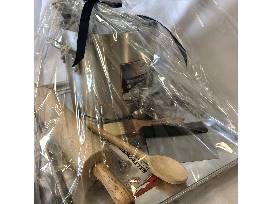 Whether you're an aspiring chef or are just looking for some great new cooking supplies, this is the package for you! Includes a baking sheet, stock pot, 7" santoku knife, measuring cups set, rolling pin, wooden spoon, thermometer, brush, tablespoon set and baking scraper.