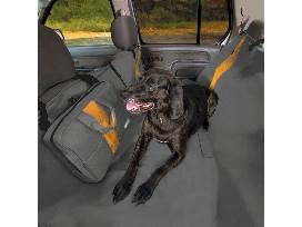 Perfect for any dog on the go! Protect your car seats from mud & dirt with this easy to install Wander Hammock (Charcoal). It hangs between the front and back seats, offering extra protection from pets and kids. It blocks your pup's access to the front seat keeping him safely in the back seat as well as provides a nice hammock nest for dogs that need a little extra support or often fall into the foot well. Paired with a red Kurgo Zippy portable water Bowl and a Mackenzie Couture leash, collar & keychain. The Mackenzie Couture Accessories product line allows every member of the family (including the 4 legged ones!) to wear color with prestige, distinction and quality.