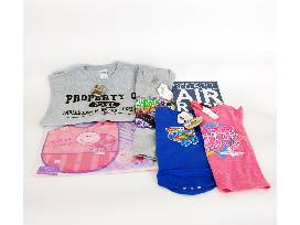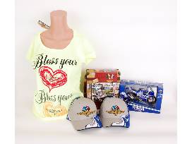 An assortment of items from the Indianapolis Motor Speedway including a 2016 Air Race magazine, a miniature Yamaha motorcycle, an IMS puzzle, a men's M t-shirt, a women's L t-shirt, a youth M t-shirt, an 18-mo. T-shirt, a kids size 6 t-shirt, a romper, a bib, a placemat, and two adjustable IMS hats