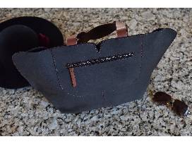 The smoky grey leather exterior has a solid, matte finish that is accentuated by copper stitching and bold brown handles. A sharp, flat bottom contrasts the playful rounded V on top that adds a flirty touch.