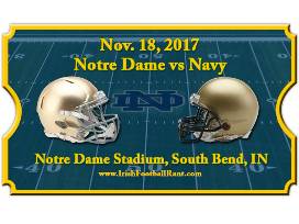 Four tickets to see the Notre Dame Fighting Irish football team take on Navy Midshipmen at historic Notre Dame Stadium on Saturday November 18th. Kickoff is at 2:30 PM CT. These are beautiful 50 yard-line seats! Seats are located in section 27, row 44, seats 7-10. PLUS: Visit the sideline before the game!