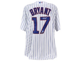 A Cubs jersey signed by star Kris Bryant. Bryant made his major league debut in 2015 and won the National League Rookie of the Year Award. He won a World Series championship with the Cubs in 2016, and was named the National League Most Valuable Player. This jersey is the Cubs classic white pinstripes.