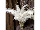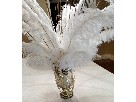Style E Includes: 25 White ostrich feathers - 8-26" 1 Large urn / candle holder Beaded garland Dark gold accents styrofoam ball 6"