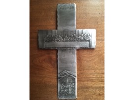 Six (6) front row seats for the SJS Christmas Program are reserved for you! Your parents, in-laws, or special friends will thank you! In turn, thank them with this engraved aluminum cross with Last Supper & Epiphany depictions made from recycled aluminum soda cans. Also included is this adorable pair of fuzzy moose, which will rest nicely on a shelf or mantel.