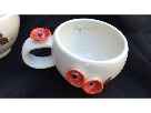 1Two tea cups from Crazy Cat Lady Ceramics' Purrfect China Collection. Each small paw print is hand printed and applied. They are made of English Porcelain and have real 24k gold on them. They are hand thrown and decorated. These cups are simply puurfect for a fine cup of tea or a Turkish coffee. They are retro, classy and add some furry fun to any home. They retail $70 for the 2 cups.