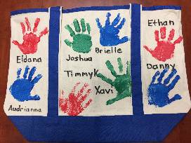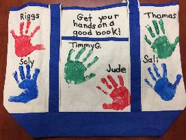 The CLA K3 & K4 classes love story time--and art projects! The winner receives this tote bag with each student's hand print on it filled with 12 of their favorite books. Books are: