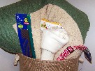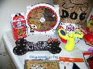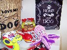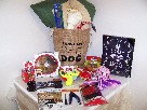 Spoil your big dog with this basket dedicated just to big dogs! It includes a brown burlap bag stamped with "I Love My Dog," a Grreat Choice X Large Dog Bed with a sherpa center measuring 33 by 45 inches, a comb, a 24-inch bone, a large red and white flowered collar, a $5 gift certificate to Canine Affinity, a nail clipper and file set, a Kong Air Dog Squeaker, Kong Cute Seas, a Kong Classic, four Kong Ziggies, extra-large doggie boots, a "Beware of Dog Kisses" sign measuring 11 1/2 by 6 inches, a "Home is Where Your Dog is" home decor sign measuring 11 by 14 inches, and plenty of treats!