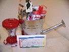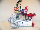 With spring just around the corner, be prepared for working outside in the garden with this collection! This basket contains: a an adorable cement statue of a cherub holding a puppy (measuring 7.5 by 5 inches), a $15 gift certificate to Allen's Landscaping, a metal watering can, a metal flower Pick, two reusable hummingbird feeders, two Pawtriotic peanut butter dog bone treats, an original birdola thistle sock feeder with nyjer seed, a Pine Tree Farm Hi- Energy Suet Cake, Oats for Cats, a spade, and a dog treat.