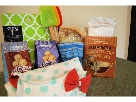 A darling Anthropologie white apron with blue polka dots; Medium Royale Cutting Board 7.875" x 11.5" by Core Kitchen; Crepes Cookbook: 50 Savory and Sweet Recipes by Martha Holmberg; 3 silicone spoonulas; Pyrex 2-cup glass liquid measuring cup; 2 Silicone Potholders, one silver, one pink; Includes 6 oz package of Guittard semi-sweet baking bars, Guittard unsweetened rare red dutch baking cocoa powder; and 3 homemade jams from Sola Foods, including: