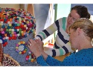 "Marble(less) ottoman." The students in both second grade classes made around 250 felt balls by hand, marble size!!! They used wool, a tea strainer and some soapy water and then wiggled out beautiful felt balls. They stringed together the felt balls that they made and the 1,000 hand-made felt balls we purchased from self-employed housewives in Nepal/ Katmandu ( a group of women, who are fighting against child labor). The 1,250 felt balls are handsewed to the ottoman cover and decorated with felt colorful circles.All feltballs are arpun 2cm and from 100% wool, the cover is 100% recycled felt.