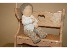 A handmade weighted newborn 14" Waldorf baby, full layette/accessories, a handmade wooden cradle and chair. The doll is made out of organic materials, wool, sand and love, and is free of any plastics. A weighted Waldorf baby provides wonderful sensory input for a child and hours of imaginative play. The Morning Glory kindy children dyed the fabric for the accessories with mama helper Nikki.