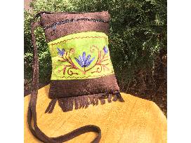 Over-the shoulder brown & green bag with floral and fringe detail.