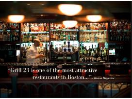 Enjoy DINNER FOR TWO at one of Boston's best steakhouses: Grill 23 & Bar. Grill 23 & Bar has been named Boston's top Steak and Seafood Grill for over 30 years. Consistently named Boston's Best Steakhouse by The Improper Bostonian Magazine and Boston Magazine, as well as New England's Best Steakhouse in New England Travel & Leisure Magazine. Please mention gift certificate when making reservation. Expires 6/30/18, excludes tax and gratuity.