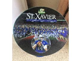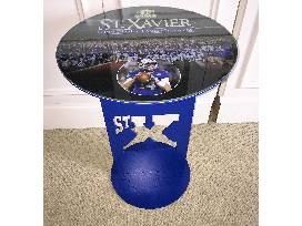 Truly a one-of-a-kind piece of furniture, this custom round table commemorates the 2016 Division I State Champion Football victory! The clear tabletop displays a full-size photographic image of the entire team, with your choice of four different color image layouts. Dimensions are The table top rests on a metal pedestal base in Bomber blue with the St. X logo.