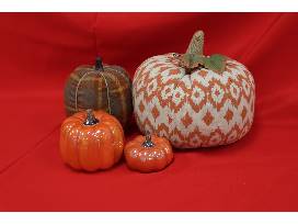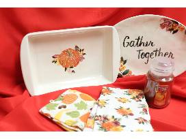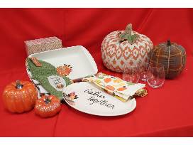 Prepare and serve your Thanksgiving feast with a platter and casserole dish and four (4) stemless wine glasses. The fall table runner, dish towels, an orange and white designed fabric pumpkin and additional decorative pumpkins will make your home even cuter in the fall.