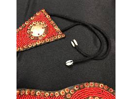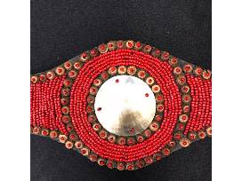 Red hand-beaded belt with wood, shell and glass beads. One-size. 31" long, plus 9" ties on each end. Center design is approximately 4.5"