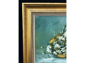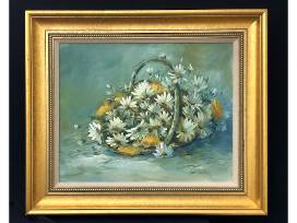 Beautiful still life of a basket of daisies in the morning sun. Oil on canvas; framed in gold leaf with grey glazing. Dominate color pallet; blue-greens, white, yellow and dark blue shades.