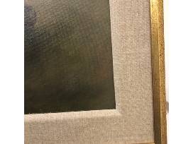 Rendition of Rembrandt sitting in a chair gazing downwards in contemplation; not holding his head but merely touching it as in a pensive moment.