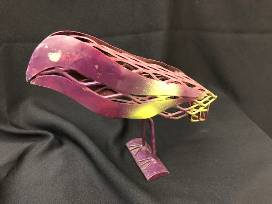 Artist, Judith Ellias Ochs of Metalmama's Ironworks is a "Iron Maiden" Interior Architect and Teacher. Judith presents her handmade metal sculpture, "Iron BIRD;" accented in violet, pink and neon yellow.