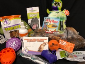 Enjoy a basket filled to the brim with dog toys, accessories and treats, including:
