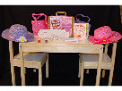 An adorable package consisting of a child-sized table and 2 chair set from IKEA, Butterfly Tea Set Basket, girls tea party dress up set for 2 and " My Very First Tea Party" book. Features: table (24" wide x 19" deep and 18" high), 23 piece porcelain tea set in basket, a pair of sun hats, purses, gloves and jewelry.