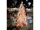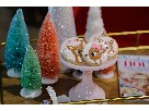 Get ready to say "remember when?" - this tree is a vintage vision chuck full of nostalgia. A classic white tree circa 1950 is covered in silver tinsel, authentic vintage ornaments, and retro elves bursting with bright shades of pink, red, and blue. A gold bar-cart holds more vintage stuff including a pink milk-glass cake stand and a collectors' Christmas magazine.
