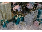 With a distinctly feminine flair, poinsettias, hydrangeas, and lilies, combine with glittered curling willow branches and feathered plumes. Feminine shades of pink and cream accent puffy bows and a swirling tulle tree skirt. A candy dish overflows with pearls and diamonds on an antique dressing table amid beautifully wrapped packages. Merry Christmas, darling women everywhere!