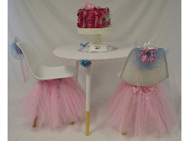 The high bidder will win this personalized table and 2 chairs for the "Birthday Fairy Princess". This hand crafted one-of-a-kind item will make your little girl feel extra special! The prepared party comes with invitations, plates, napkins, princess crowns, fairy wings and other party supplies. The Birthday Fairy Princess has her own birthday sash, crown and cupcake tower. Included is a $50 gift certificate to Schnucks for her desired birthday cake or cupcakes.