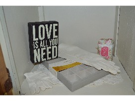 Antique armoire is finished in chalk paint and finishing wax. It has four drawers, closet, shelf, and original hardware that came with the piece. Item comes with a rose and yellow floral lap quilt, a vintage handmade yellow children's sweater, antique mother and daughter white gloves, vintage purse, jewelry tray, peony bath soap, two handmade doilies and a wooden sign that says: "Love is all you need."