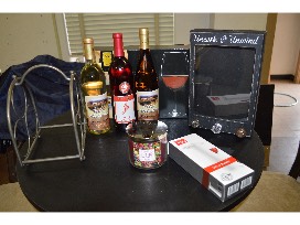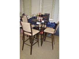 Create a polished look in your game room, bar area, or casual dining space with this inviting and versatile auction item. This quality set was one of the last pieces purchased from Hopkins Furniture in Festus. With a black round top wine table and four dark bronze pub chairs with warm, inviting beige cushions to add comfort. The bold lines of the frame compose a clean and sleek design. To complete your wine table we have included three bottles of wine, a three bottle wine rack, set of 4 wine glasses, decorative wine cork holder, Vacu Vin Wine Saver, and a mulled wine scented candle. Bid high and make memories around this wine table.