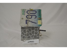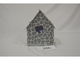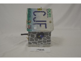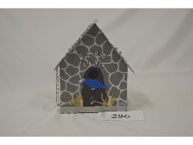 This bird house, designed as a "bird cave", features an one of Fr. Dalton's old license plates as a roof. This was built by Keith Jensen and painted by Karla and Vickie.