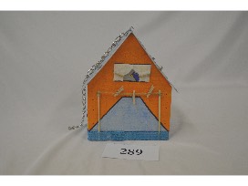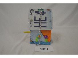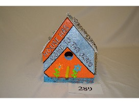 "This House Has Gone To The Birds". This birdhouse proclaims "This House Has Gone To The Birds" and an old license plate of Fr. Dalton's that serves as a roof. Built by Keith Jensen and painted by Karla and Vickie, your birds will love their new home.