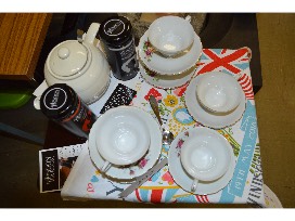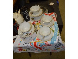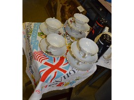 This TV tray holds a ceramic teapot with strainer, tea spoon, The Naughty Vicar and The London Tea Room Blend teas from The London Tea Merchant, and the vintage porcelain Japan tea set of six cups and matching saucers with a beautiful dark pink rose floral design. The makeshift tablecloth is a commemorative flag announcing the wedding of Prince Harry and Meghan Markle at Windsor Castle.
