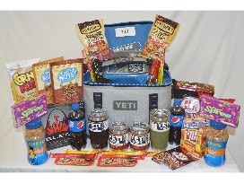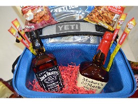 Along with the cooler, this package includes two YETI 20 oz. Tumblers and two YETI 10 oz. Ramblers (for your hot or cold beverages), a large bottle of Maker's Mark, a large bottle of Jack Daniel's, a 20 pack of Bud Select, soda, and snacks.