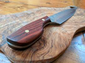 One-of-a-kind chef knife made of 1095 high carbon steel and Cocobolo and finished using differential hardening to heat treat the knife and bring the cutting edge to a high degree of hardness.