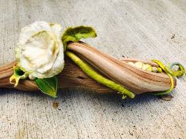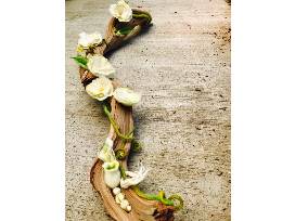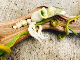 A stunning centerpiece hand-crafted by Kinga Snowhorn, Shelley Caskey and Carson Fustes. Delicate felted flowers wrap around reclaimed driftwood, bringing the colors and textures of a warm spring day to life.