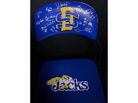 Authentic SDSU team chair autographed by the 2017-18 SDSU men's basketball team. Donated by SDSU Athletics.