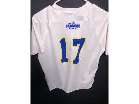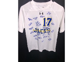 White SDSU soccer jersey autographed by the 2017 Summit League Undefeated Regular Season Champions. Donated by SDSU Soccer.