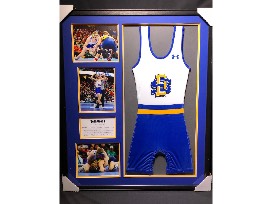 Framed Jackrabbit Wrestling singlet and prints autographed by SDSU's First Division I National Champion, Seth Gross in a 34"x40.5" frame. Donated by SDSU Wrestling.