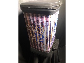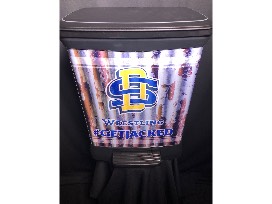 SDSU trash can featuring Jackrabbit Wrestling logos and 2017-18 statistics. Donated by Outlaw Graphics.