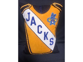 Over-sized white and yellow decorative pillow made from a Pride of the Dakotas uniform from the 1970's by Kathy Larsen.