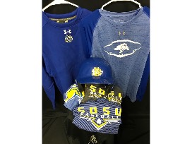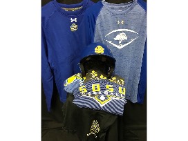 Includes a SDSU helmet, sweatshirt (size large), two (2) long sleeve t-shirts (size extra-large), two (2) t-shirts (size large), and a pair of SDSU baseball shorts (size medium).