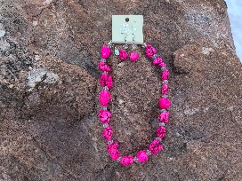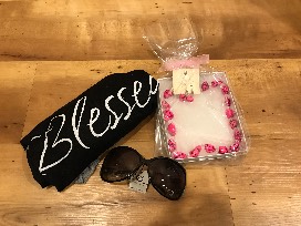 Fun women's size L, graphic "Blessed" baseball style t-shirt with hot pink stone necklace & earring set and DC sunglasses.