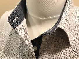 Tiny blue & white patterned cotton Sherry Cervi women's western shirt with button front and chest pockets. Coordinating blue cuffs, placket and collar band.
