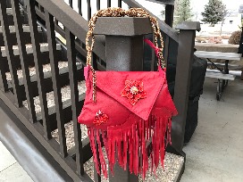 Red leather fringe and floral rhinestone handbag custom made by Julie Ewing.